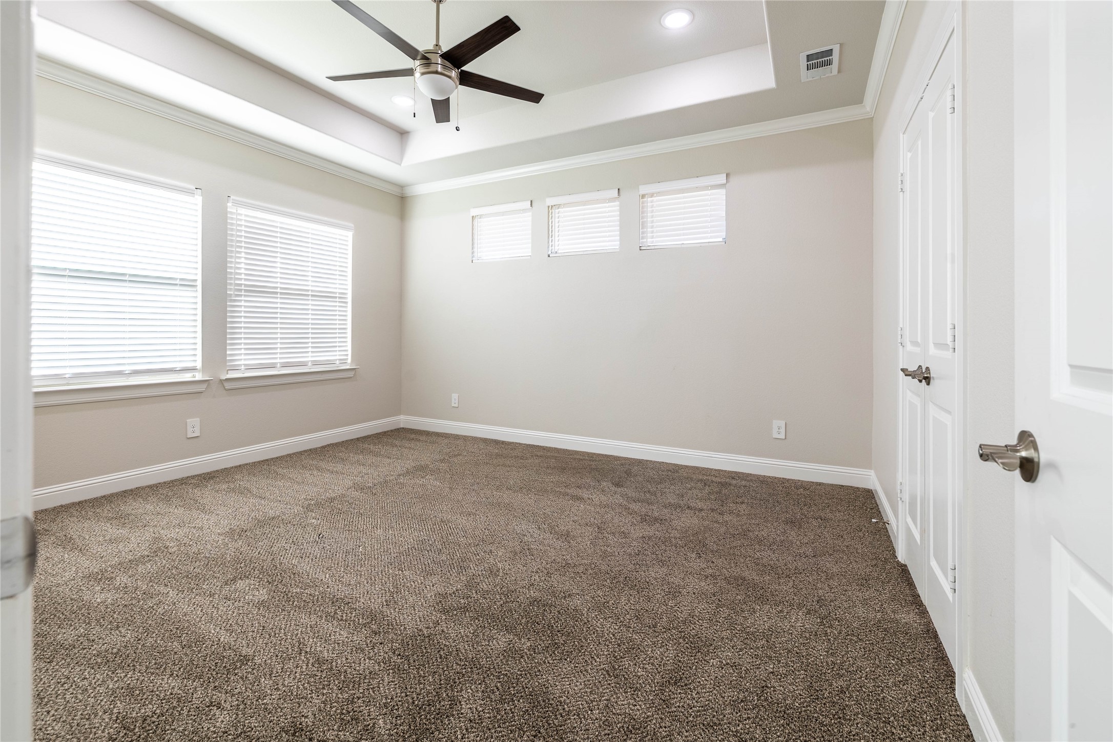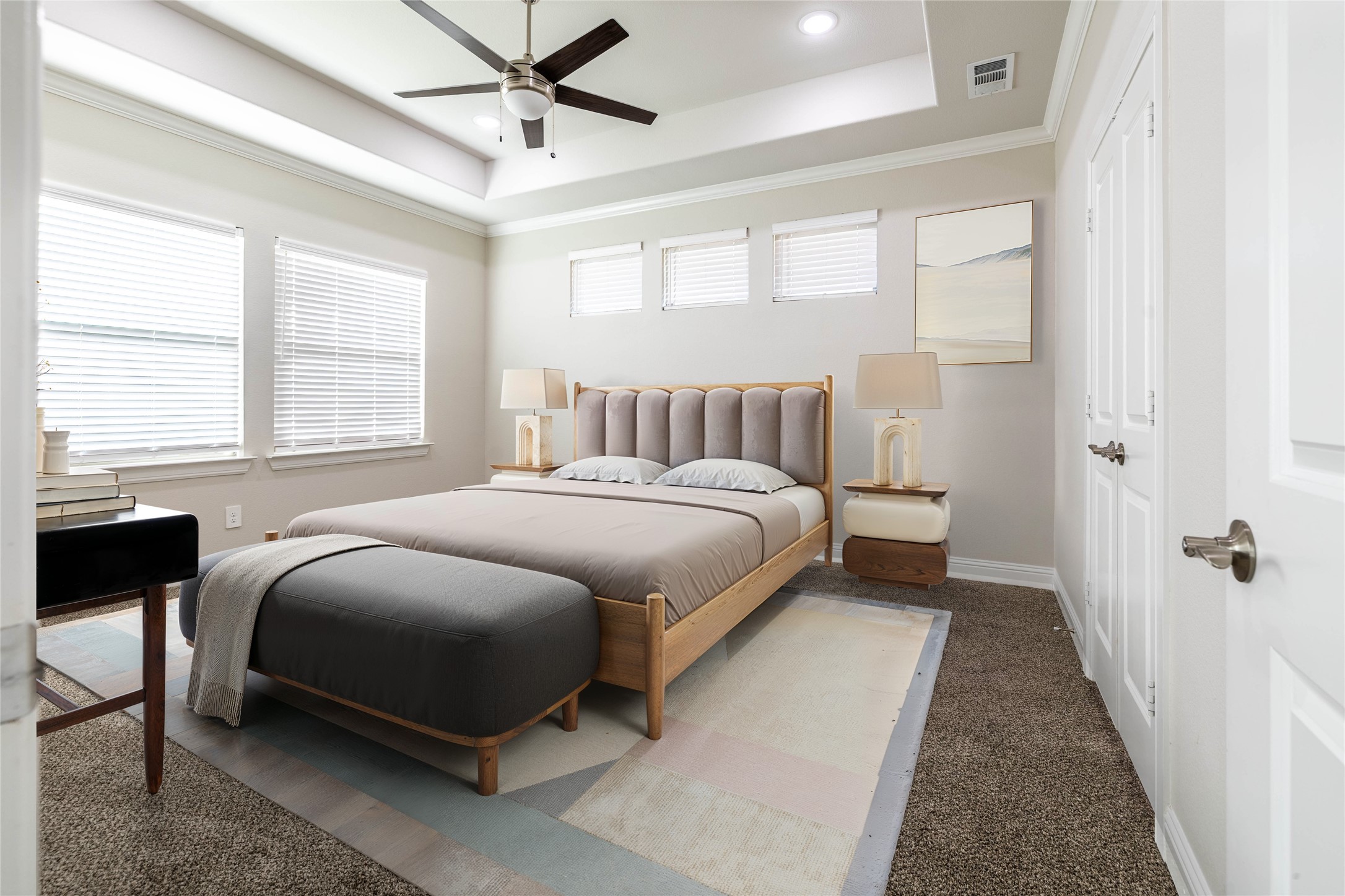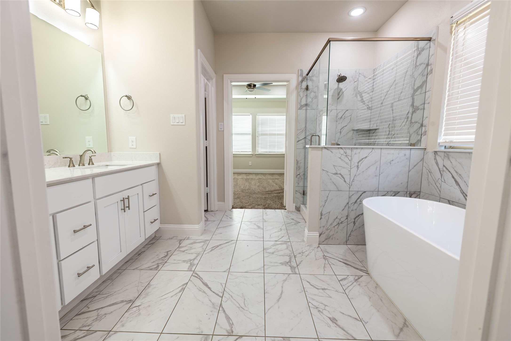 The thoughtfully designed layout provides privacy for the primary suite, complete with a tray ceiling, dual sinks, a freestanding soaking tub, separate shower, and a large walk-in closet. Secondary bedrooms are generously sized with comfortable carpeting, while all bathrooms feature modern tile finishes.
