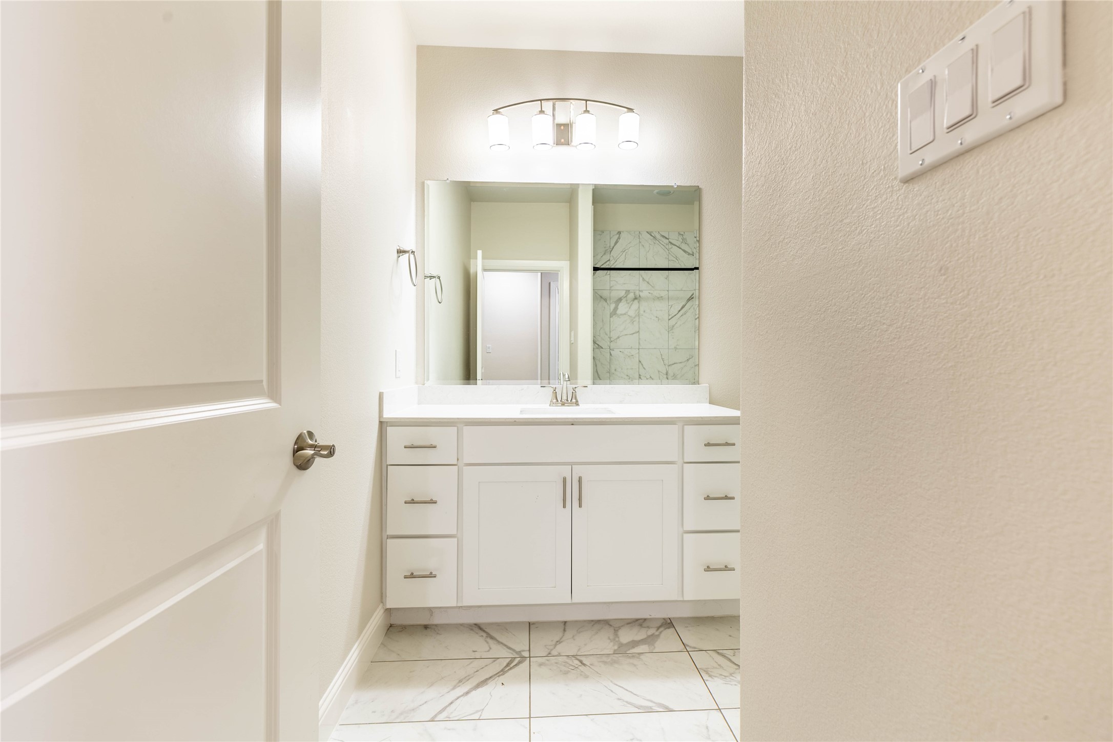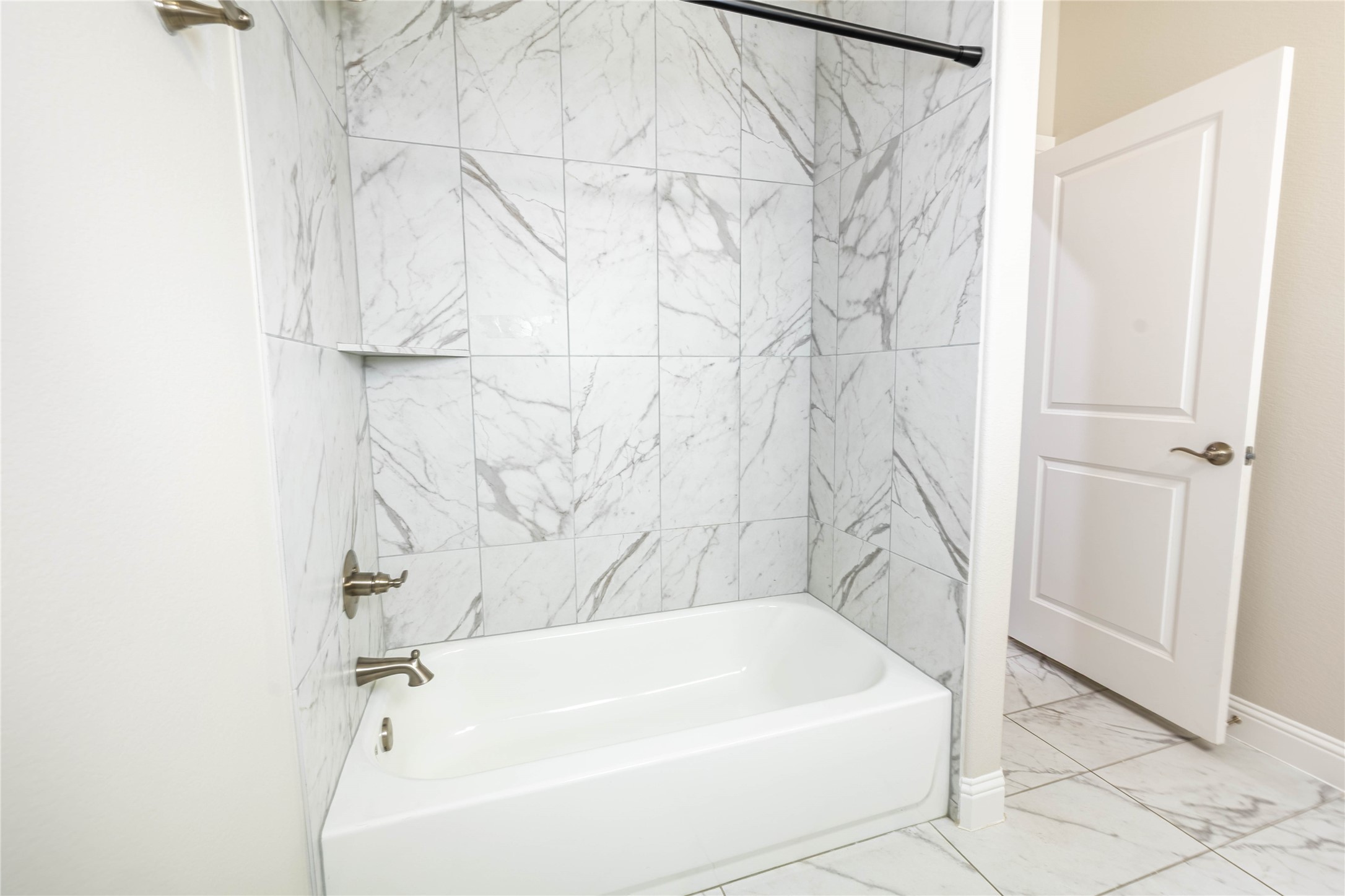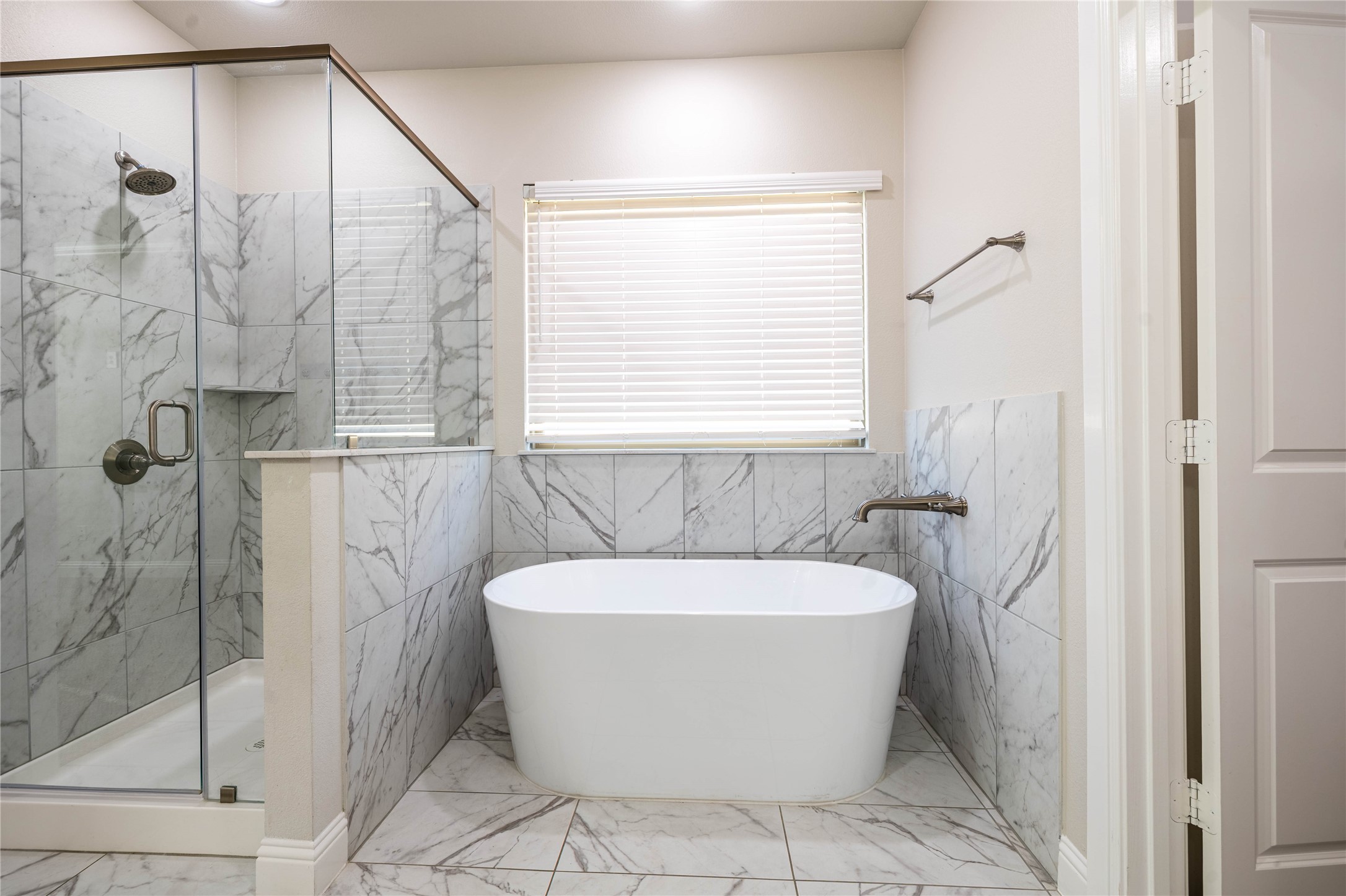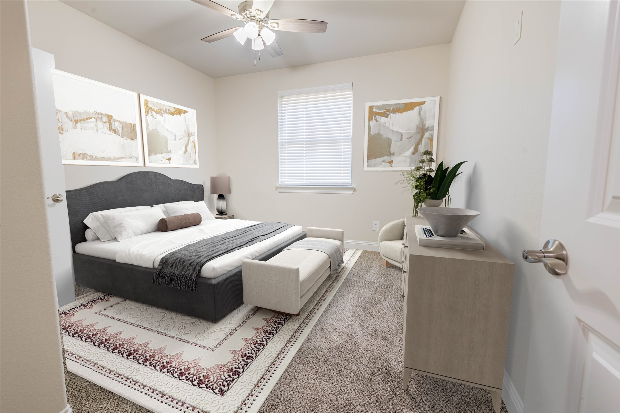 The thoughtfully designed layout provides privacy for the primary suite, complete with a tray ceiling, dual sinks, a freestanding soaking tub, separate shower, and a large walk-in closet. Secondary bedrooms are generously sized with comfortable carpeting, while all bathrooms feature modern tile finishes.