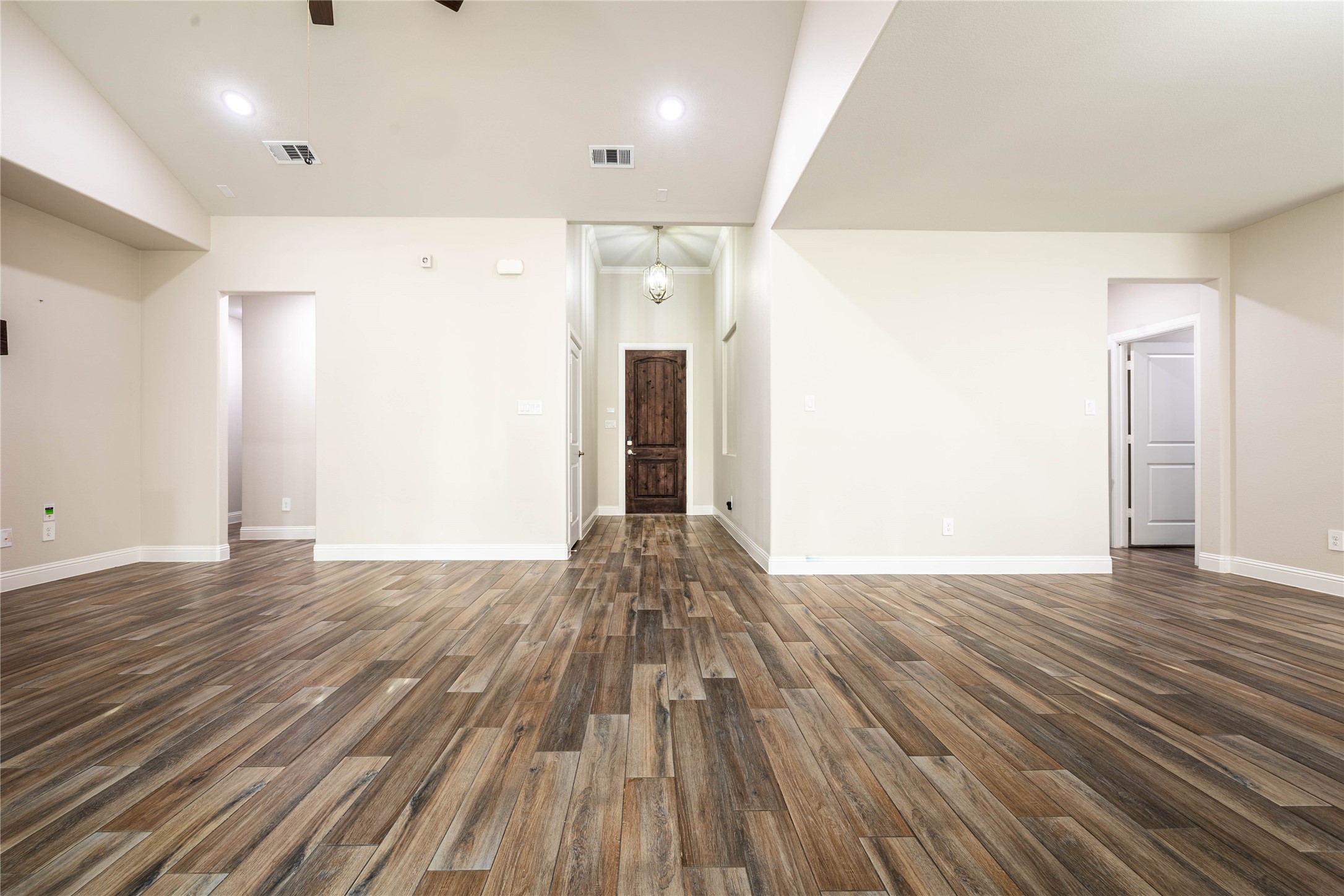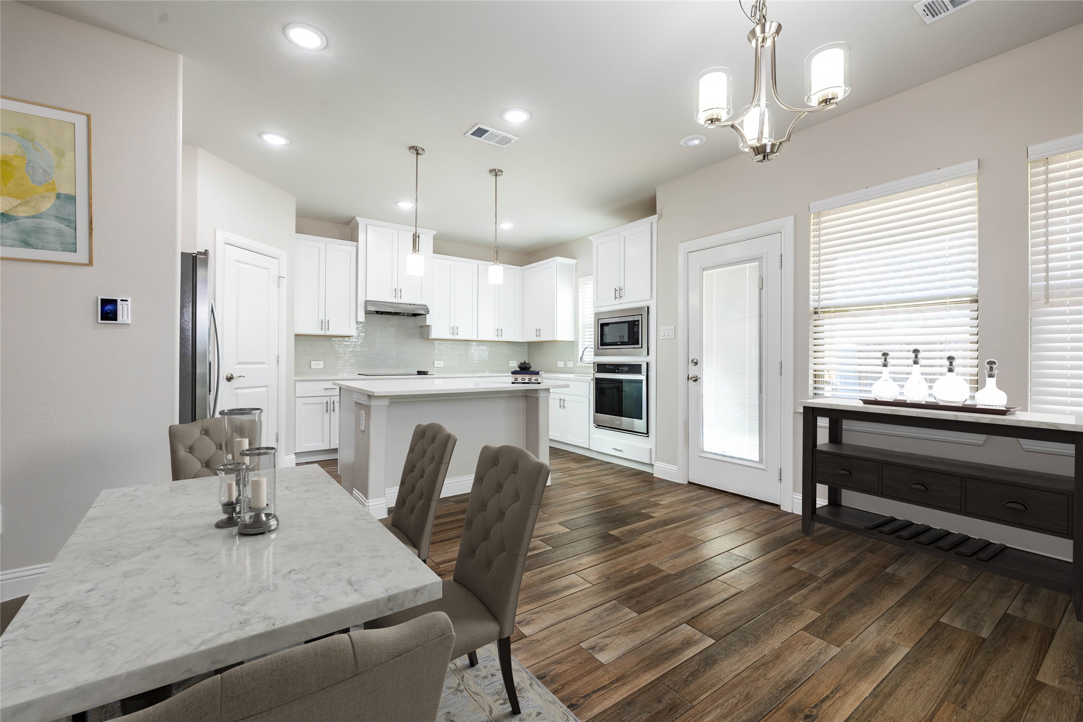 Step inside to an open-concept floorplan featuring a spacious living room with vaulted ceilings, a cozy wood-burning fireplace, and durable wood-look flooring throughout the main areas. The gourmet kitchen is a standout with an oversized island, quartz countertops, stainless steel appliances, and smart home wiring--perfect for both entertaining and everyday living.