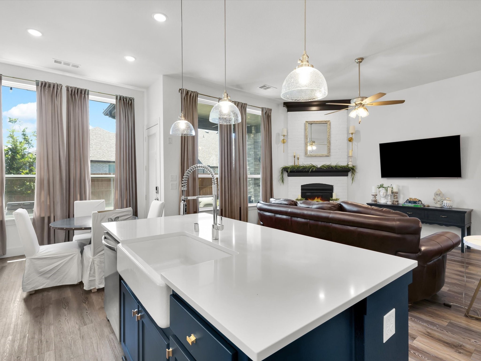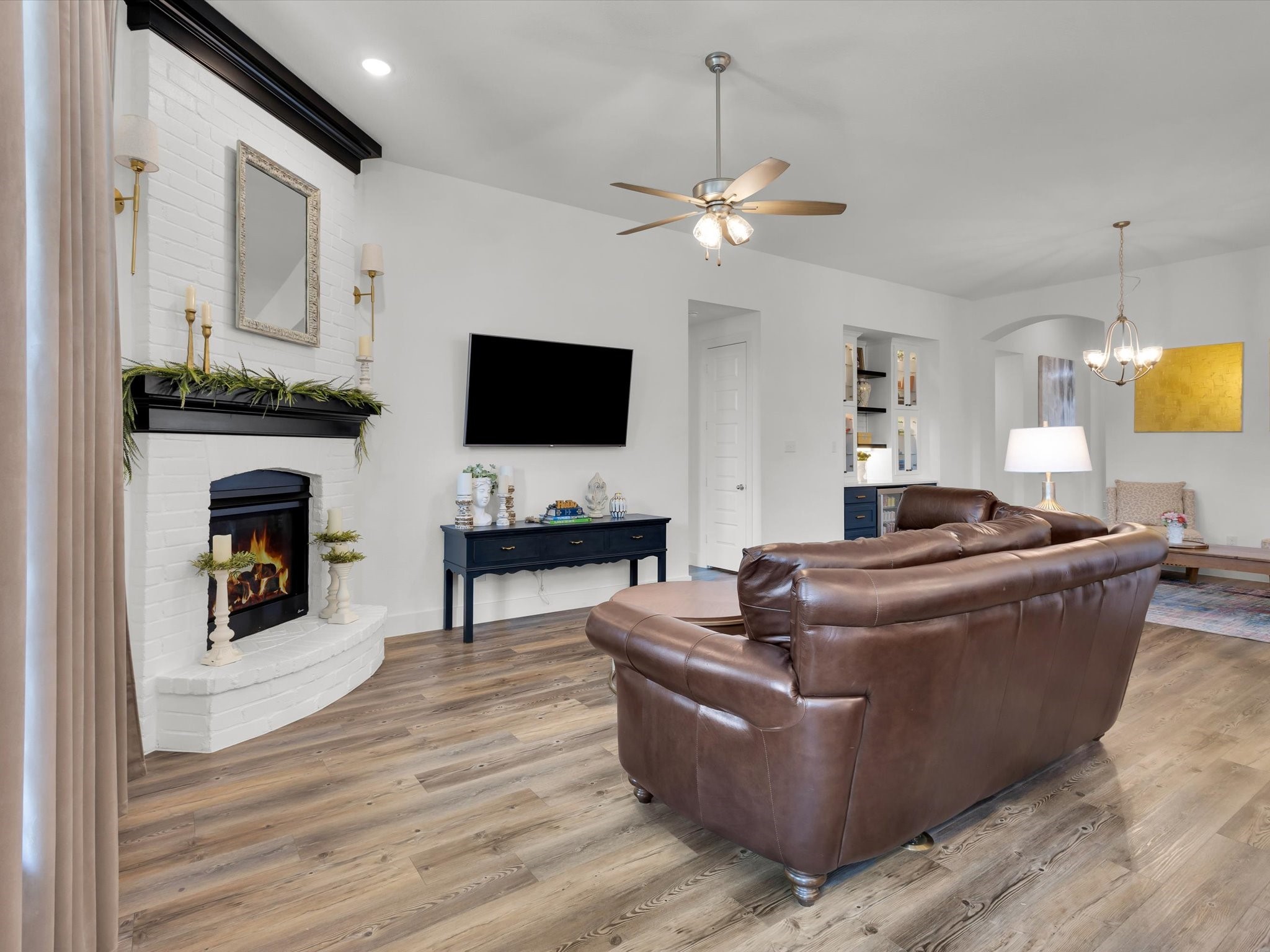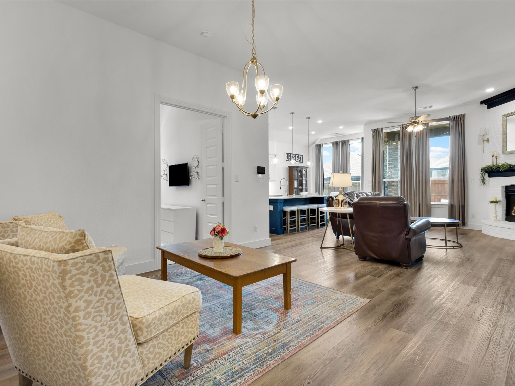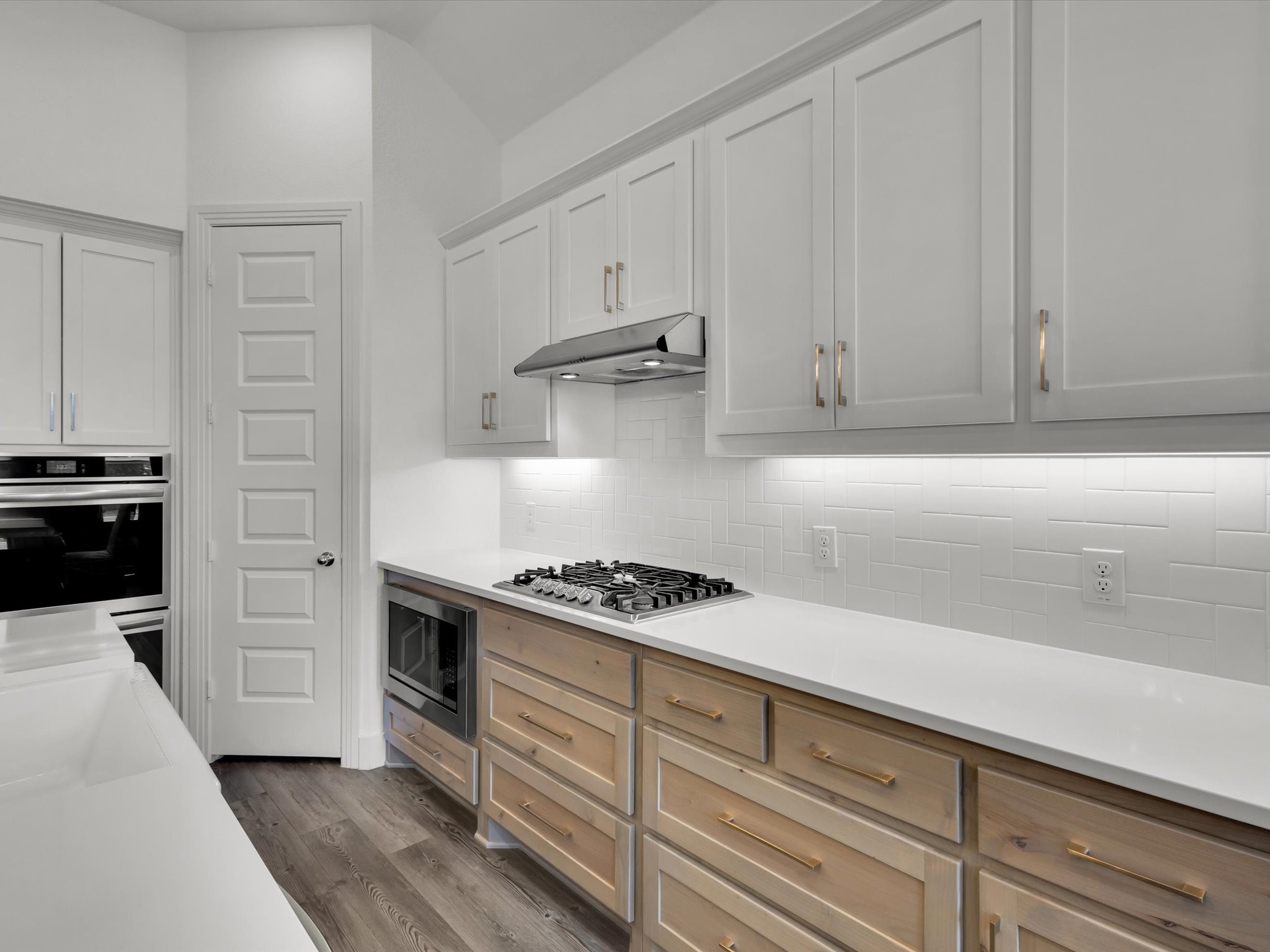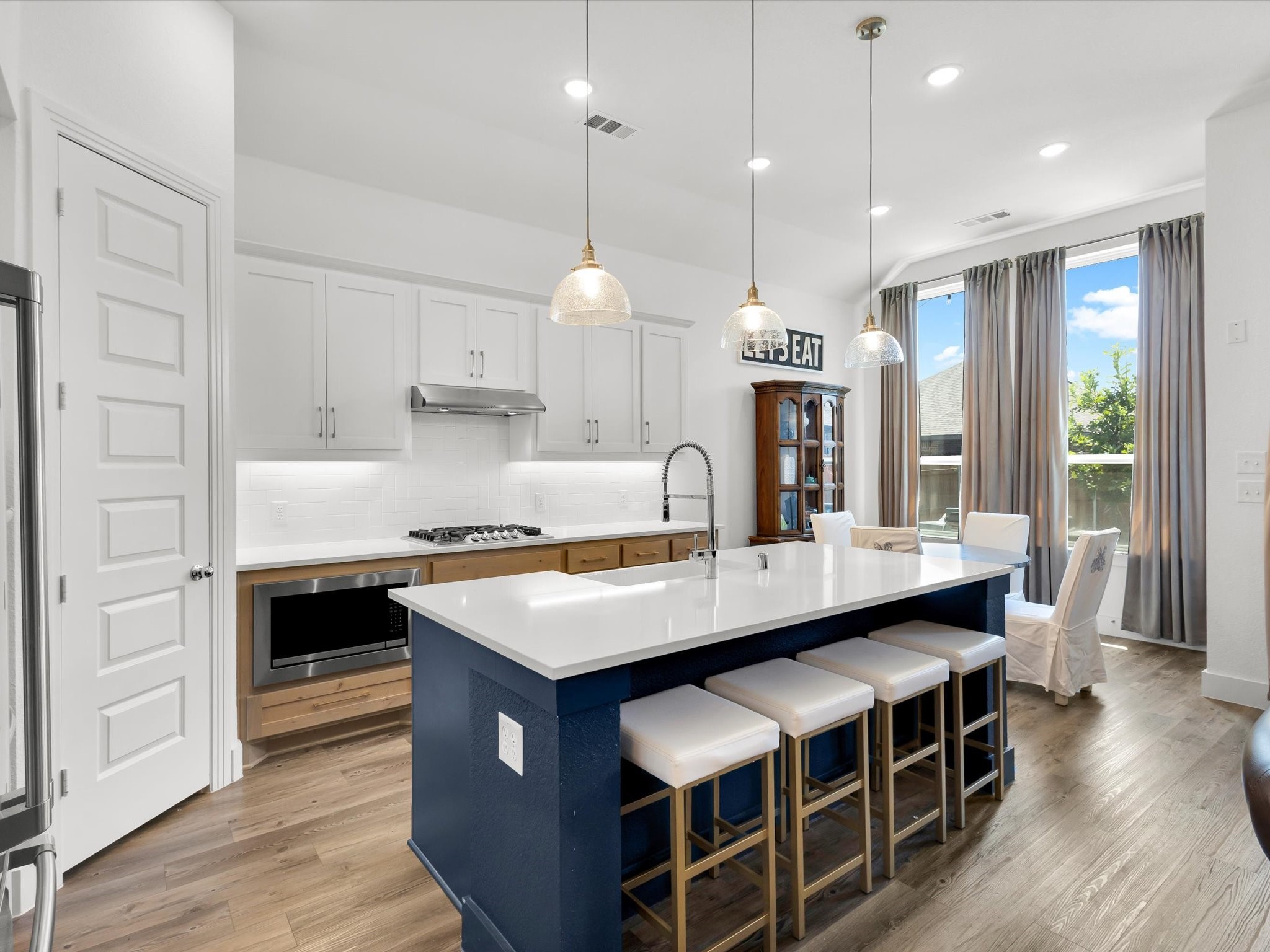 The gourmet kitchen is a showstopper with its built in mini bar, coffee bar, custom cabinets, large center island, quartz countertops, stainless steel appliances, gas cooktop, and walk-in pantry, perfect for both casual family meals and entertaining guests. Custom finishes including epoxy garage floors and design details are found throughout, adding a level of sophistication rarely seen in standard builds here in Morningstar.