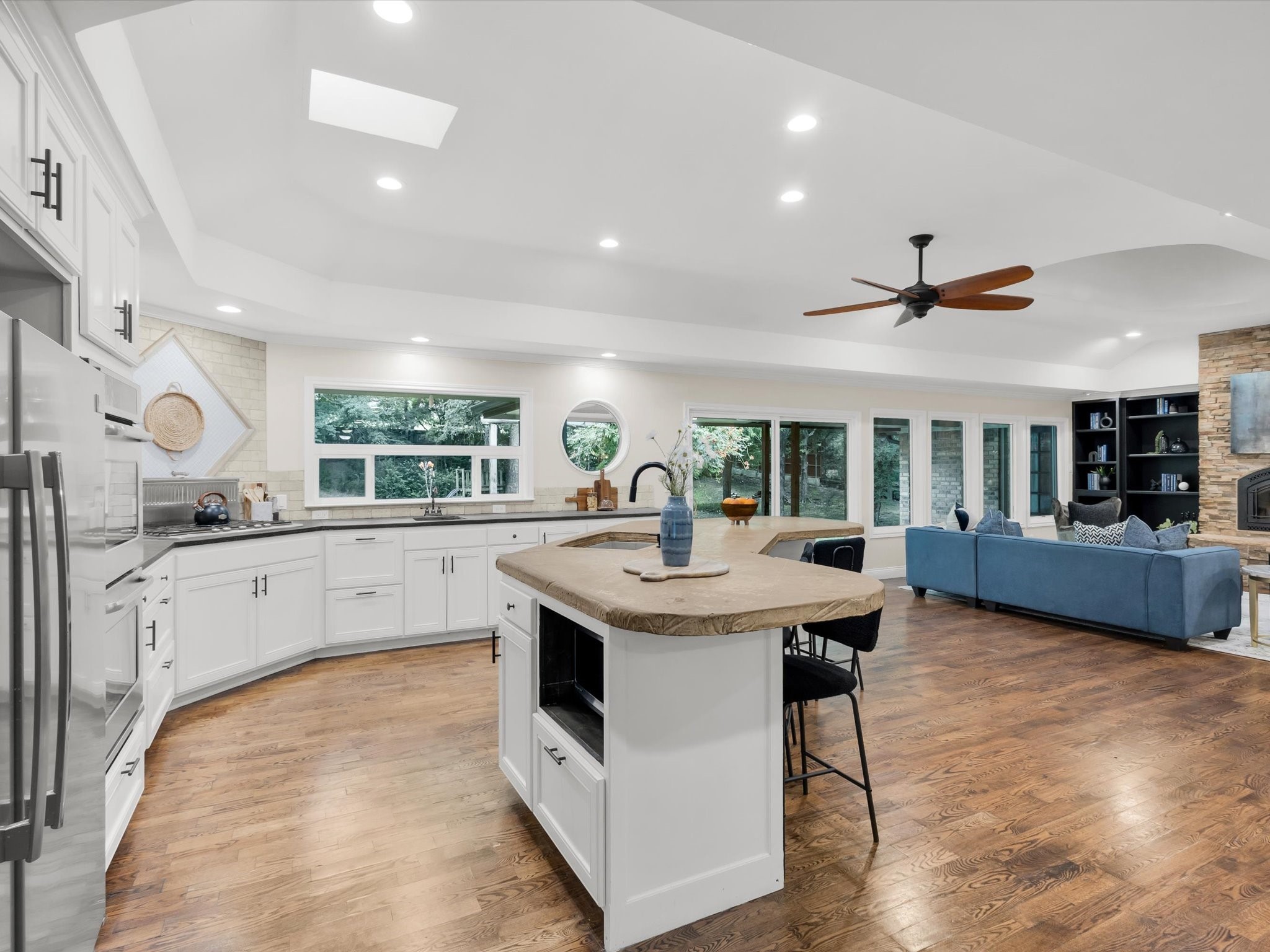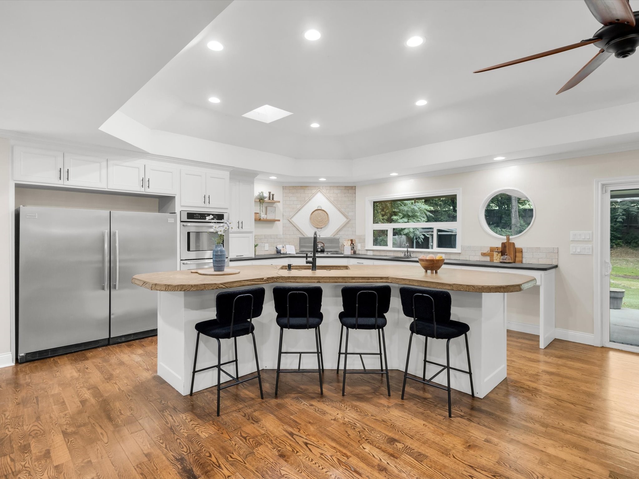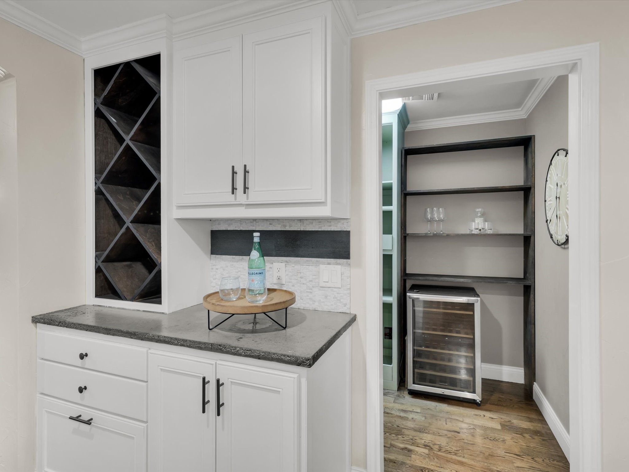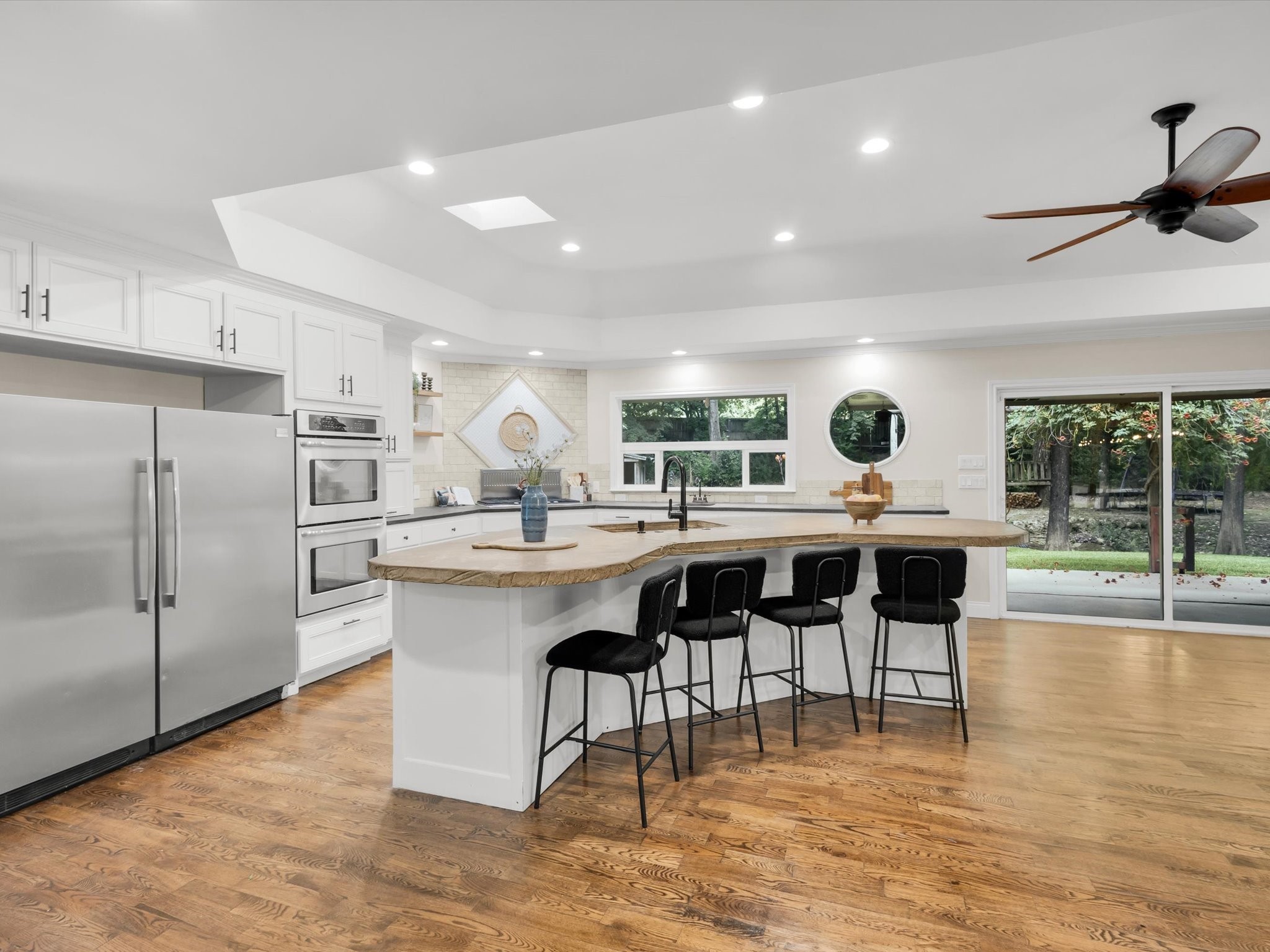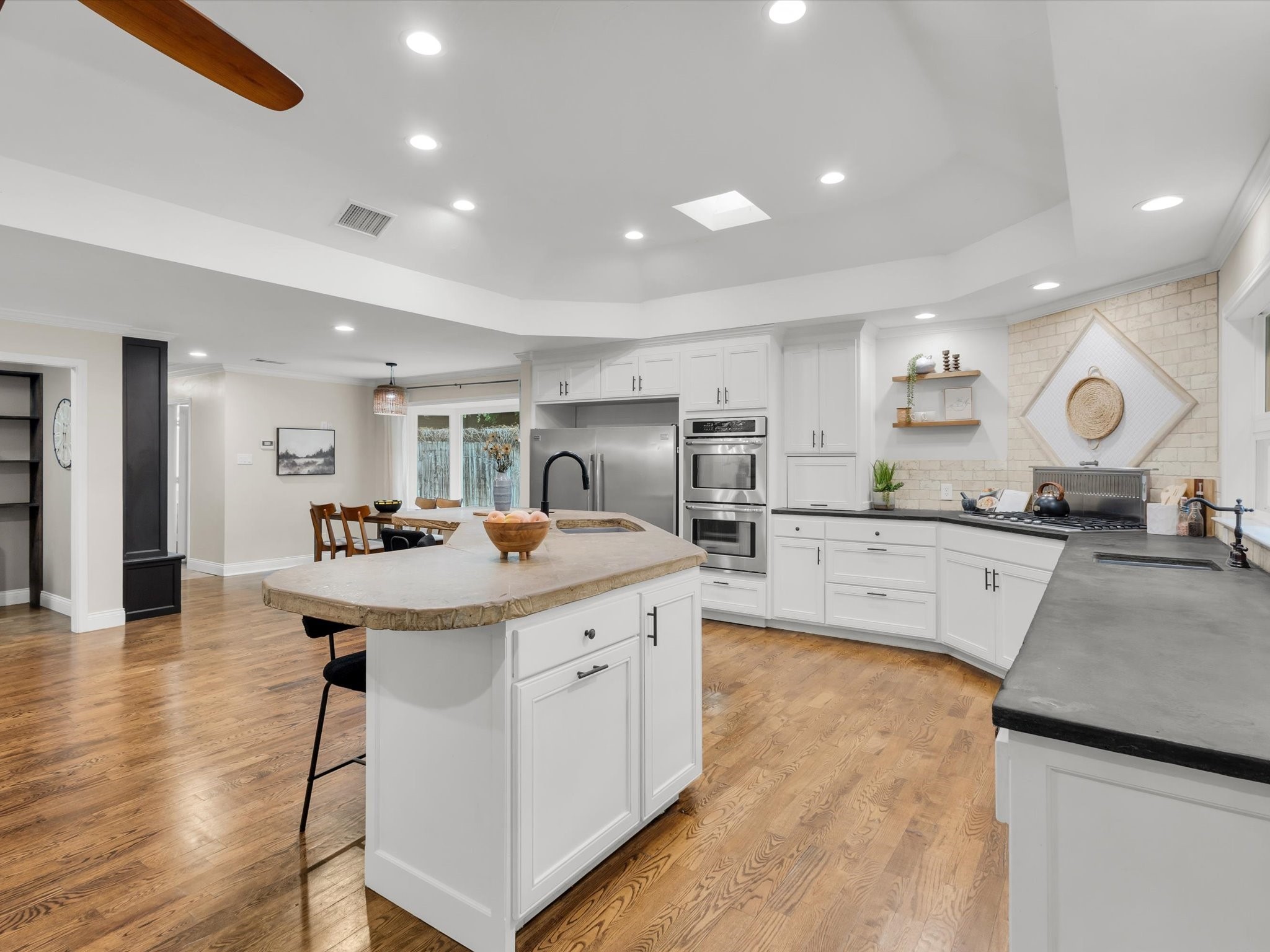The open-concept kitchen is equipped with new countertops, high-end stainless steel appliances with commercial style fridge, prep sink, breakfast bar, walk in butler's pantry with mini bar, and breakfast nook --seamlessly flowing into the informal dining space and formal dining room. Ideal for entertaining or everyday living!