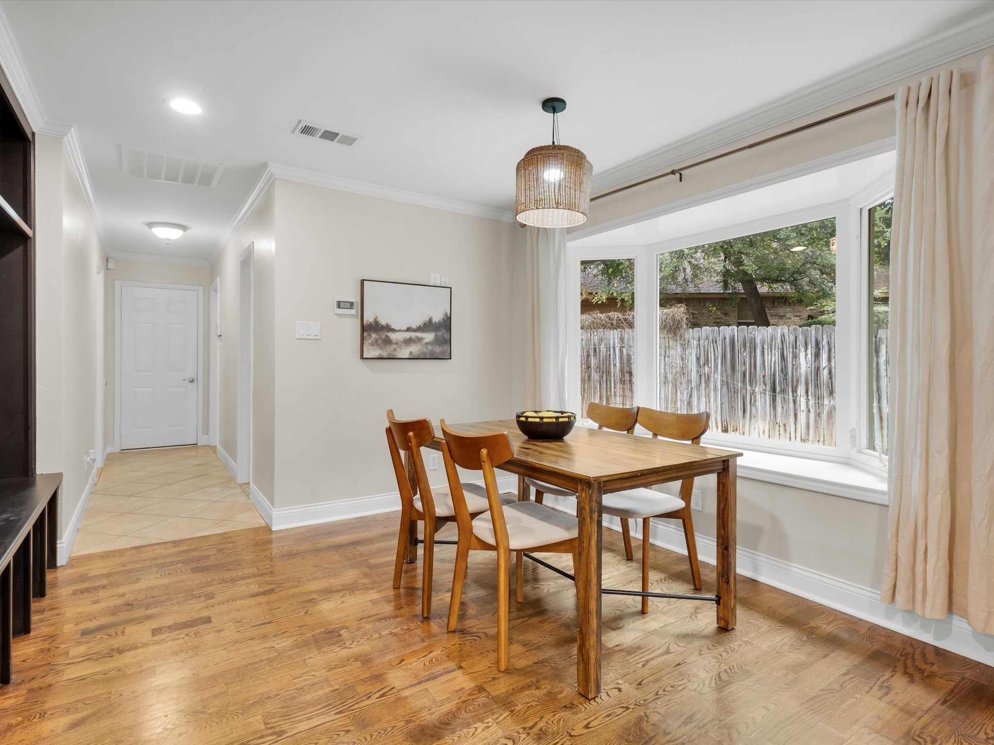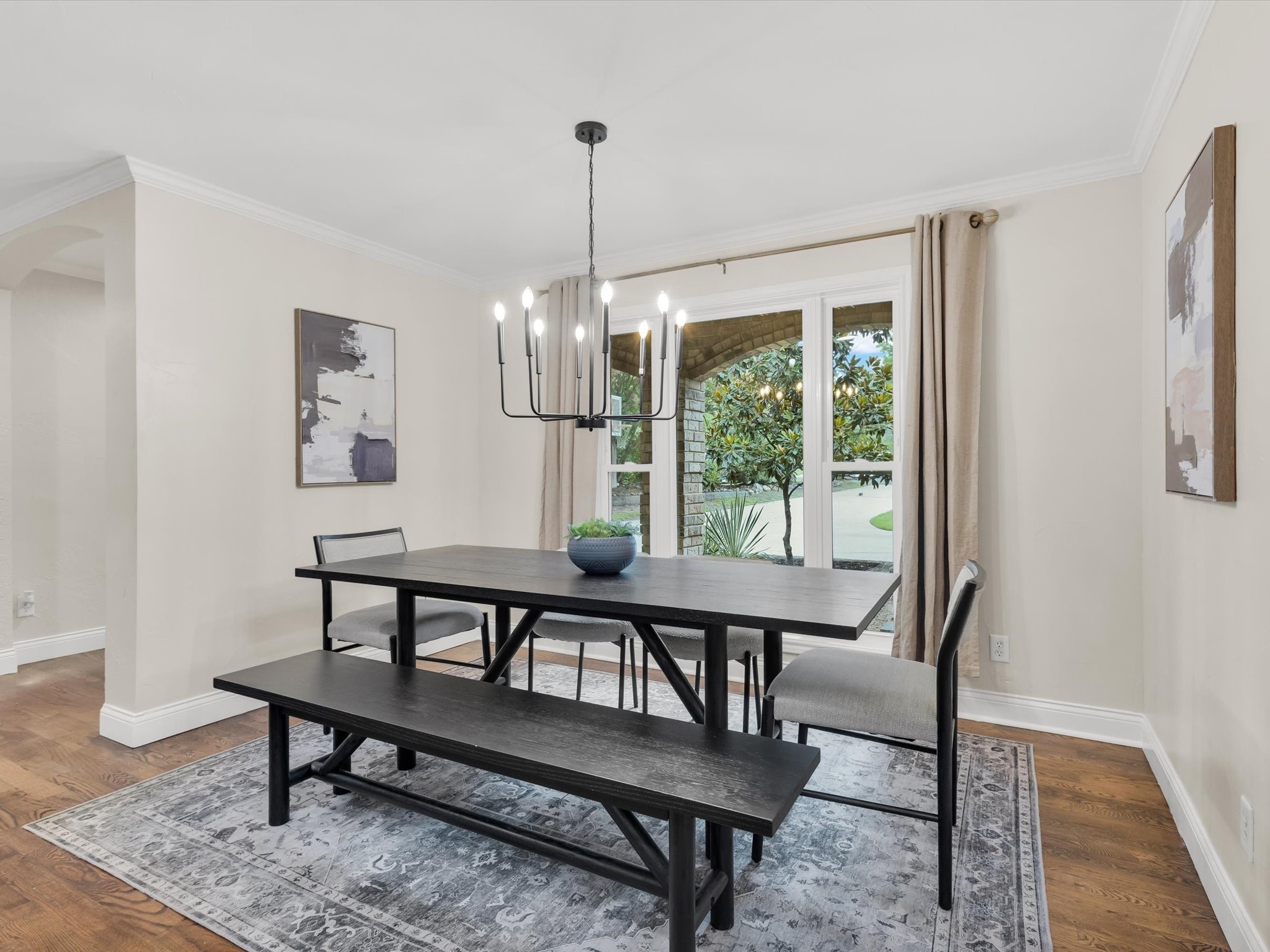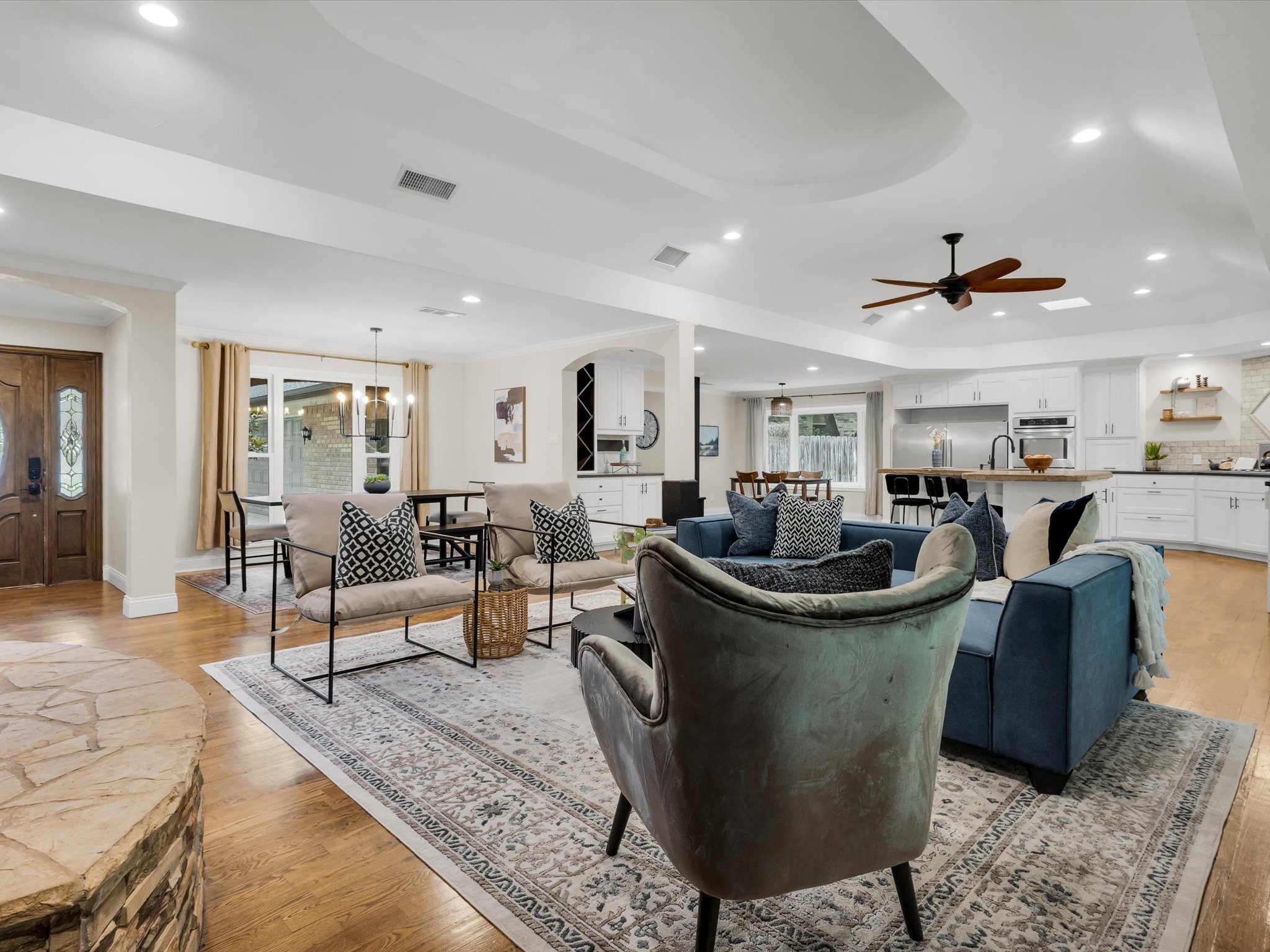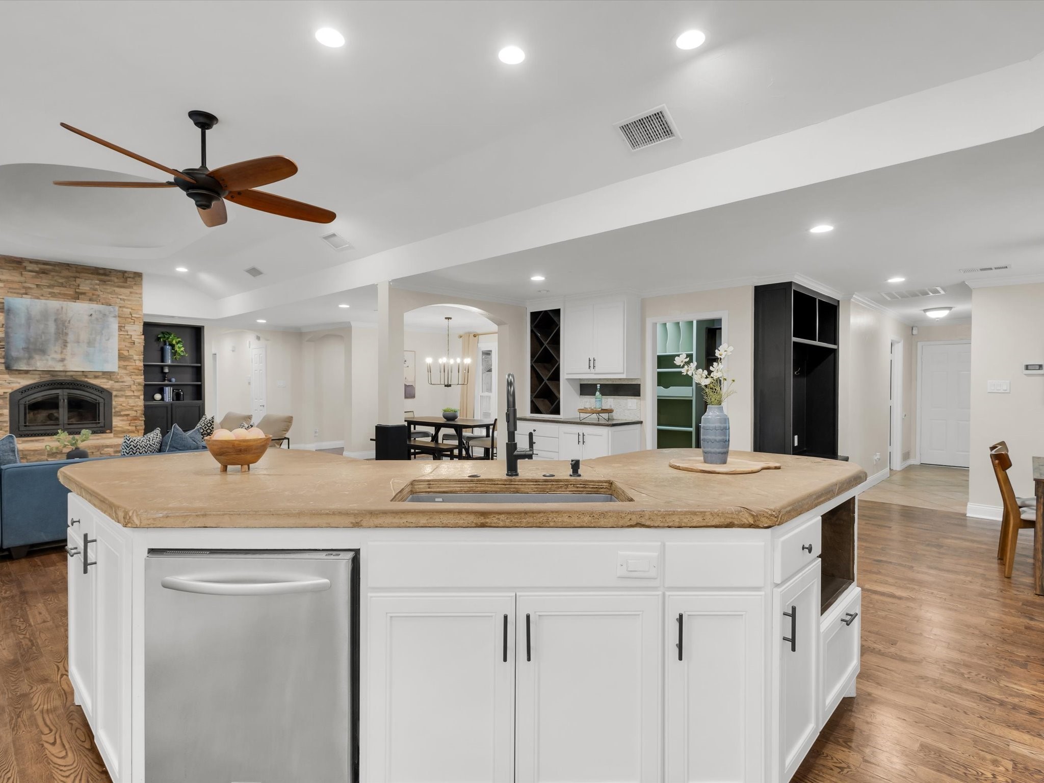 The open-concept kitchen is equipped with new countertops, high-end stainless steel appliances with commercial style fridge, prep sink, breakfast bar, walk in butler's pantry with mini bar, and breakfast nook --seamlessly flowing into the informal dining space and formal dining room. Ideal for entertaining or everyday living!