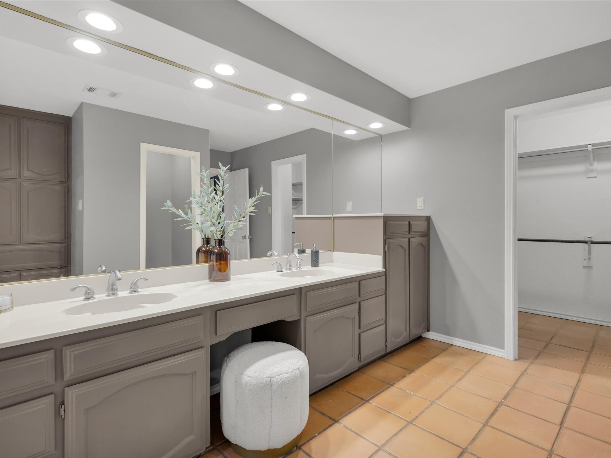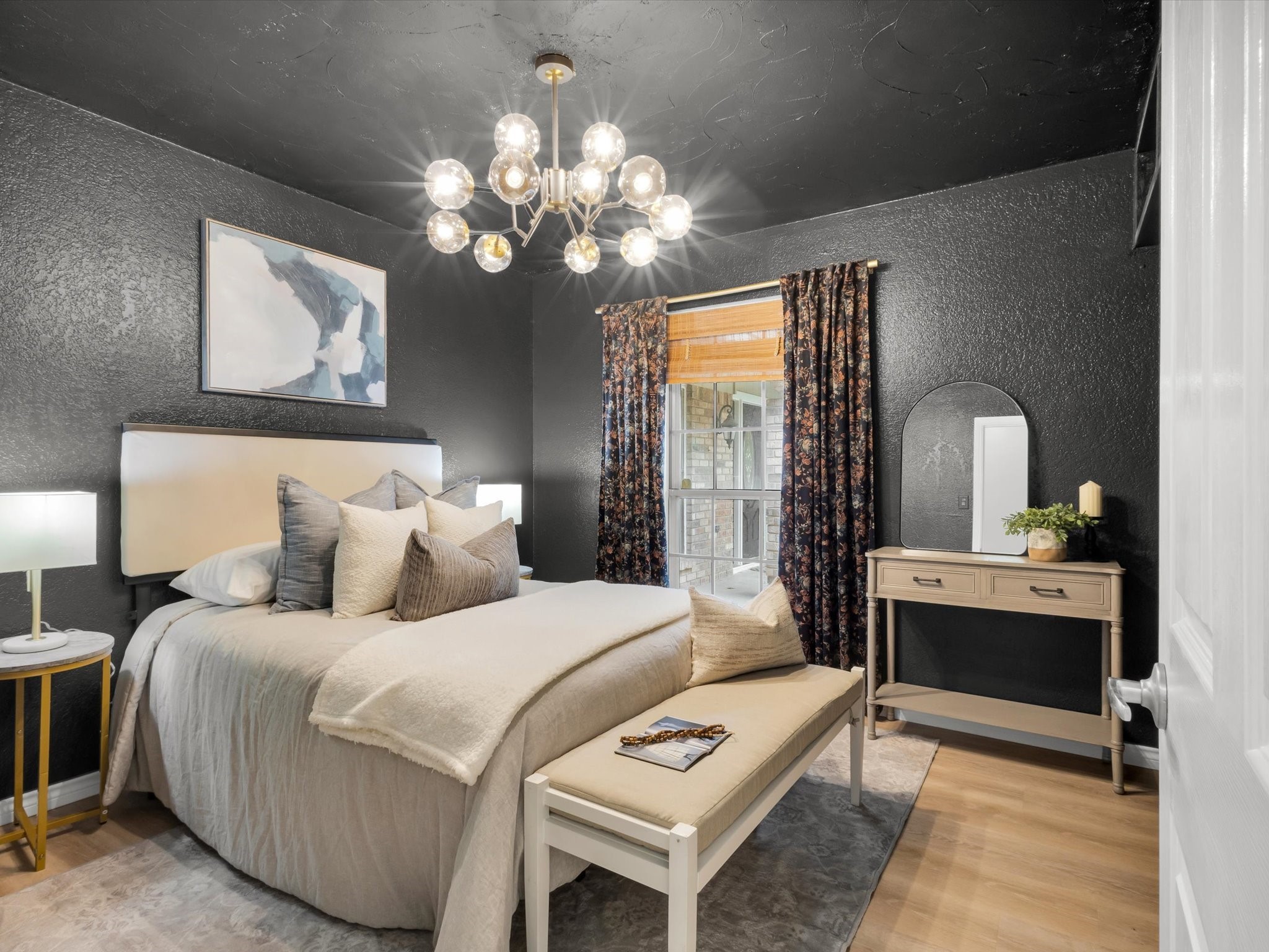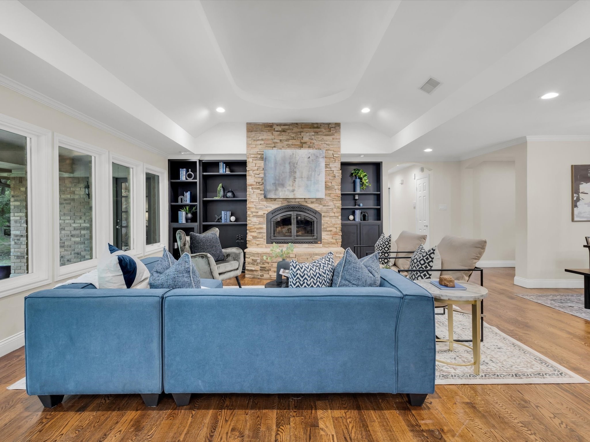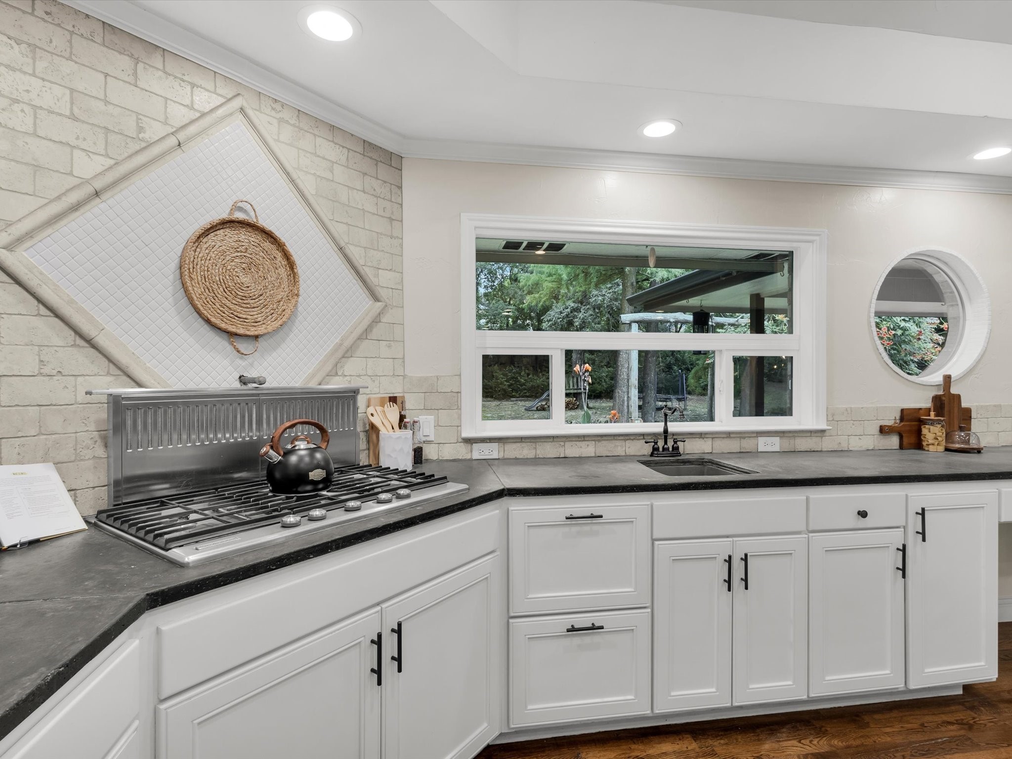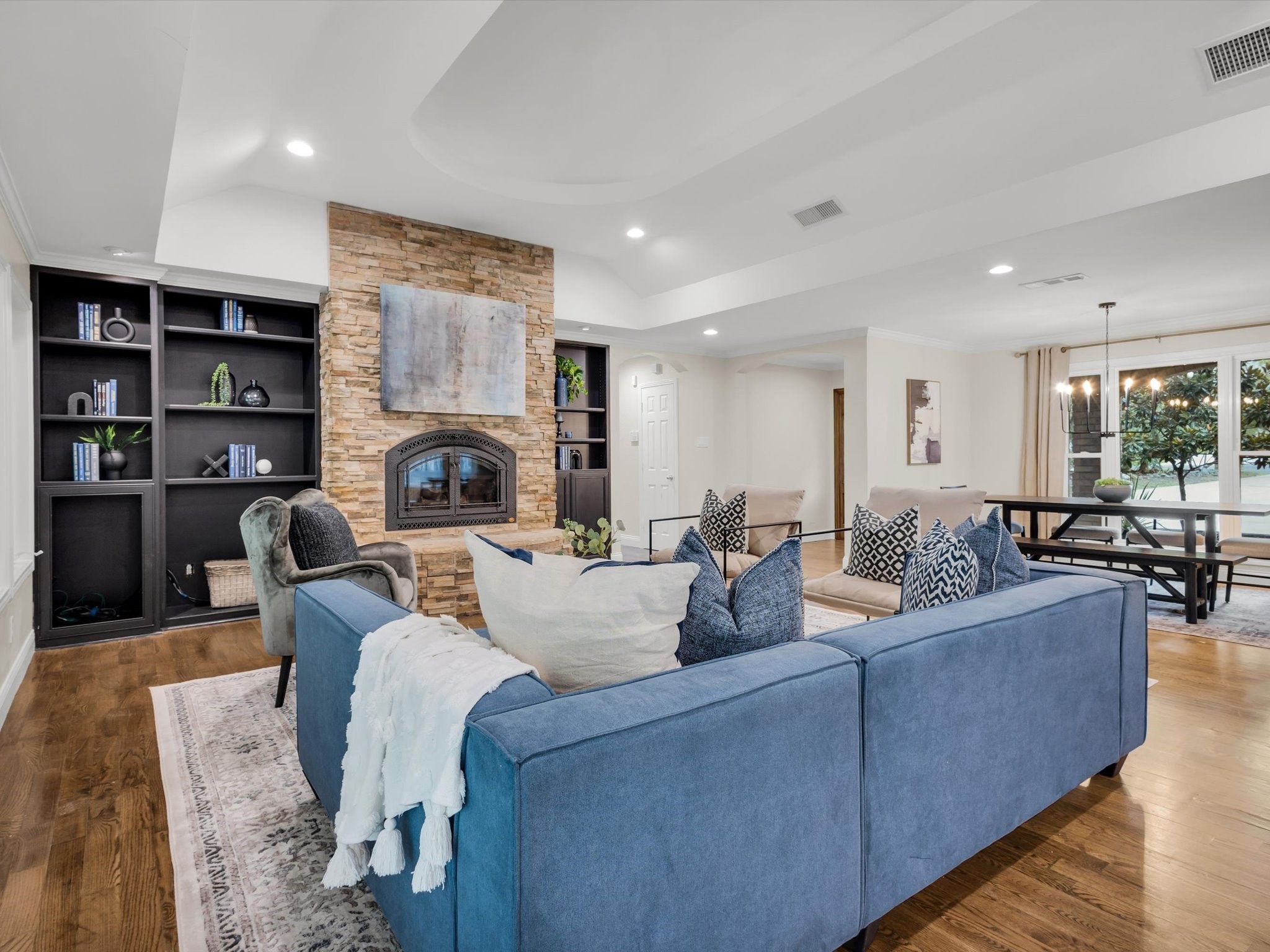 The open-concept kitchen is equipped with new countertops, high-end stainless steel appliances with commercial style fridge, prep sink, breakfast bar, walk in butler's pantry with mini bar, and breakfast nook --seamlessly flowing into the informal dining space and formal dining room. Ideal for entertaining or everyday living!