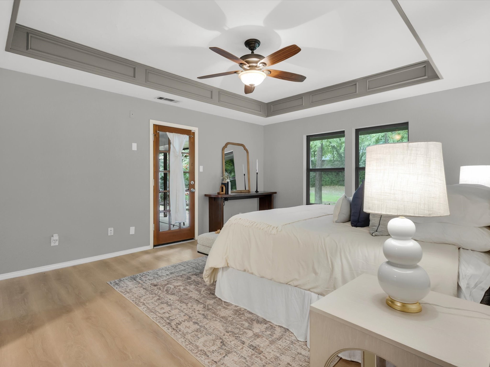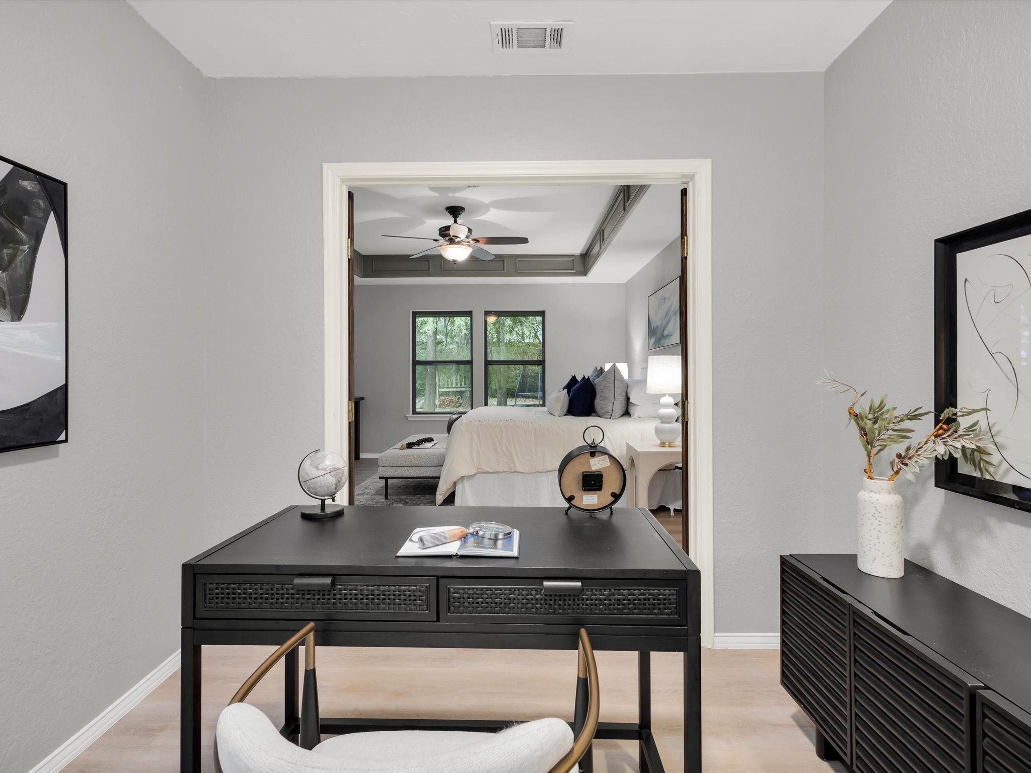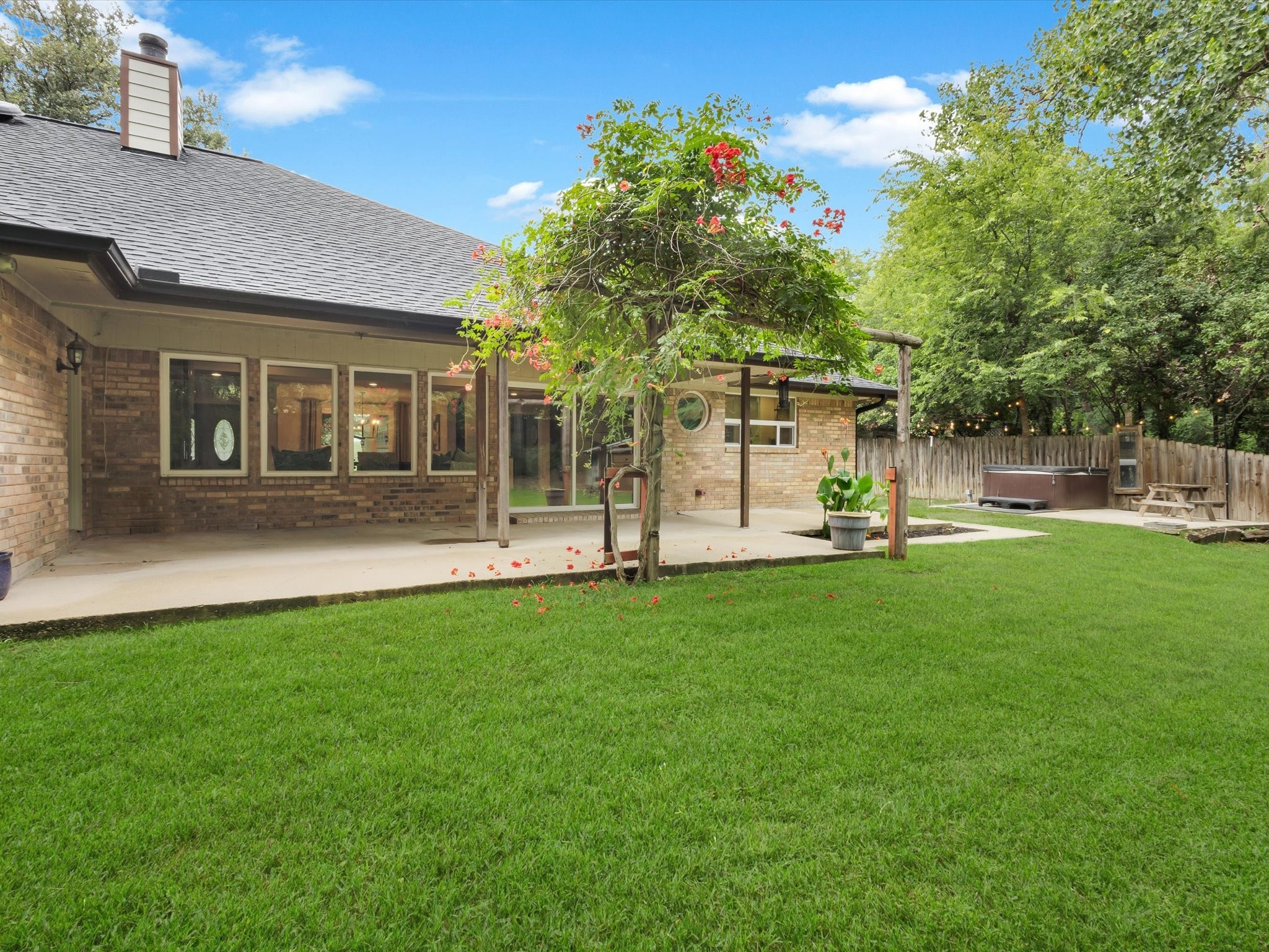 This versatile layout features 4 bedrooms, 3 full baths, including a split guest suite for privacy. The primary suite includes a bonus study or flex space--perfect for a home office, nursery, or sitting area, also offers private access to the back patio. Enjoy quiet evenings, listing to the water run, on the covered back patio surrounded by nature or dip in to your private hot tub. This home brags a new roof, tankless water heater, new floors, fresh landscaping and ample amount of storage.